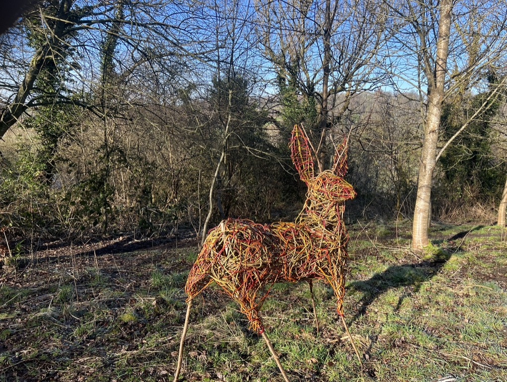 This year we used some of our colourful willow to make sculptures. Douglas the roe deer was commissioned for a conference on “Wilding gardens” at Manchester University. After featuring on stage at the conference, he has taken up residence among the trees.
